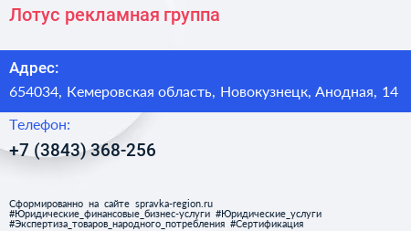 Лотус, рекламная группа по адресу 654034, Кемеровская область, Новокузнецк, Анодная, 14 в дальнейшем Организация, размещена в следующих категориях: