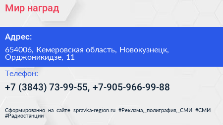 Мир наград по адресу 654006, Кемеровская область, Новокузнецк, Орджоникидзе, 11 в дальнейшем Организация, размещена в следующих категориях: