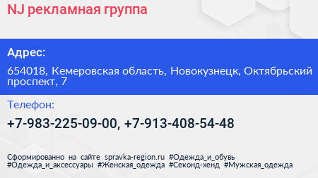 NJ, рекламная группа по адресу 654018, Кемеровская область, Новокузнецк, Октябрьский проспект, 7 в дальнейшем Организация, размещена в следующих категориях: