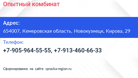 Опытный комбинат по адресу 654007, Кемеровская область, Новокузнецк, Кирова, 29 в дальнейшем Организация, размещена в следующих категориях: