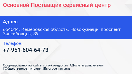 Основной Поставщик, сервисный центр по адресу 654044, Кемеровская область, Новокузнецк, проспект Запсибовцев, 39 в дальнейшем Организация, размещена в следующих категориях: