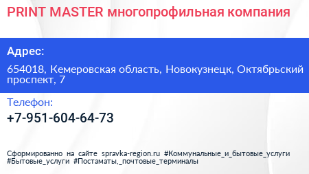 PRINT-MASTER, многопрофильная компания по адресу 654018, Кемеровская область, Новокузнецк, Октябрьский проспект, 7 в дальнейшем Организация, размещена в следующих категориях: