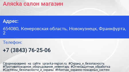 Алясkа, салон-магазин по адресу 654080, Кемеровская область, Новокузнецк, Франкфурта, 2 в дальнейшем Организация, размещена в следующих категориях: