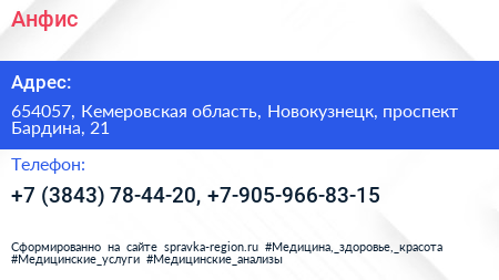 Анфис по адресу 654057, Кемеровская область, Новокузнецк, проспект Бардина, 21 в дальнейшем Организация, размещена в следующих категориях: