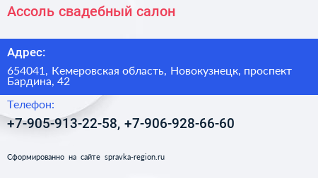 Ассоль, свадебный салон по адресу 654041, Кемеровская область, Новокузнецк, проспект Бардина, 42 в дальнейшем Организация, размещена в следующих категориях: