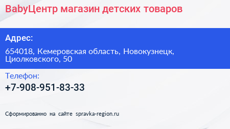 BabyЦентр, магазин детских товаров по адресу 654018, Кемеровская область, Новокузнецк, Циолковского, 50 в дальнейшем Организация, размещена в следующих категориях: