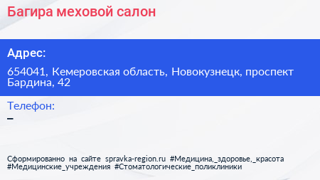 Багира, меховой салон по адресу 654041, Кемеровская область, Новокузнецк, проспект Бардина, 42 в дальнейшем Организация, размещена в следующих категориях: