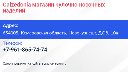 Calzedonia, магазин чулочно-носочных изделий по адресу 654005, Кемеровская область, Новокузнецк, ДОЗ, 10а в дальнейшем Организация, размещена в следующих категориях: