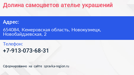 Долина самоцветов, ателье украшений по адресу 654084, Кемеровская область, Новокузнецк, Новобайдаевская, 2 в дальнейшем Организация, размещена в следующих категориях: