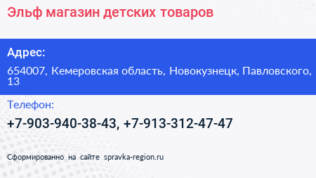 Эльф, магазин детских товаров по адресу 654007, Кемеровская область, Новокузнецк, Павловского, 13 в дальнейшем Организация, размещена в следующих категориях: