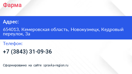 Фарма по адресу 654013, Кемеровская область, Новокузнецк, Кедровый переулок, 3а в дальнейшем Организация, размещена в следующих категориях: