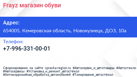 Frayz, магазин обуви по адресу 654005, Кемеровская область, Новокузнецк, ДОЗ, 10а в дальнейшем Организация, размещена в следующих категориях: