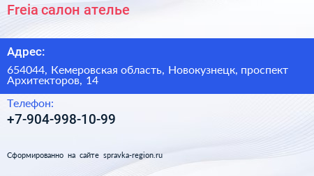 Freia, салон-ателье по адресу 654044, Кемеровская область, Новокузнецк, проспект Архитекторов, 14 в дальнейшем Организация, размещена в следующих категориях:
