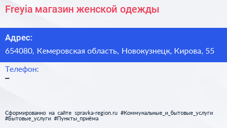 Freyia, магазин женской одежды по адресу 654080, Кемеровская область, Новокузнецк, Кирова, 55 в дальнейшем Организация, размещена в следующих категориях: