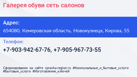 Галерея обуви, сеть салонов по адресу 654080, Кемеровская область, Новокузнецк, Кирова, 55 в дальнейшем Организация, размещена в следующих категориях: