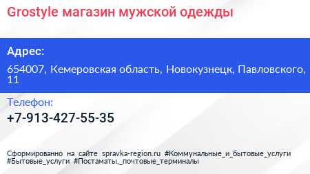 Grostyle, магазин мужской одежды по адресу 654007, Кемеровская область, Новокузнецк, Павловского, 11 в дальнейшем Организация, размещена в следующих категориях:
