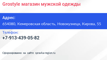 Grostyle, магазин мужской одежды по адресу 654080, Кемеровская область, Новокузнецк, Кирова, 55 в дальнейшем Организация, размещена в следующих категориях: