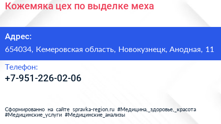 Кожемяка, цех по выделке меха по адресу 654034, Кемеровская область, Новокузнецк, Анодная, 11 в дальнейшем Организация, размещена в следующих категориях: