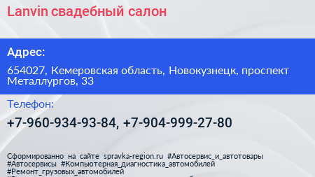 Lanvin, свадебный салон по адресу 654027, Кемеровская область, Новокузнецк, проспект Металлургов, 33 в дальнейшем Организация, размещена в следующих категориях:
