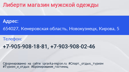 Либерти, магазин мужской одежды по адресу 654027, Кемеровская область, Новокузнецк, Кирова, 5 в дальнейшем Организация, размещена в следующих категориях: