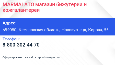 MARMALATO, магазин бижутерии и кожгалантереи по адресу 654080, Кемеровская область, Новокузнецк, Кирова, 55 в дальнейшем Организация, размещена в следующих категориях: