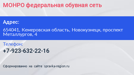 МОНРО, федеральная обувная сеть по адресу 654041, Кемеровская область, Новокузнецк, проспект Металлургов, 4 в дальнейшем Организация, размещена в следующих категориях:
