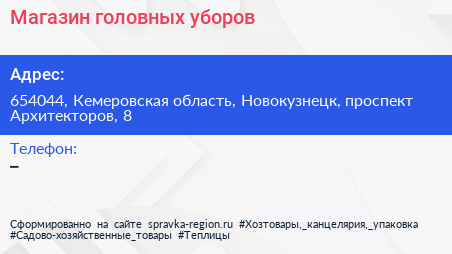 Магазин головных уборов по адресу 654044, Кемеровская область, Новокузнецк, проспект Архитекторов, 8 в дальнейшем Организация, размещена в следующих категориях: