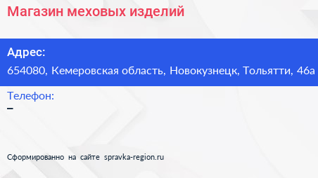 Магазин меховых изделий по адресу 654080, Кемеровская область, Новокузнецк, Тольятти, 46а в дальнейшем Организация, размещена в следующих категориях: