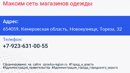 Максим, сеть магазинов одежды по адресу 654059, Кемеровская область, Новокузнецк, Тореза, 32 в дальнейшем Организация, размещена в следующих категориях: