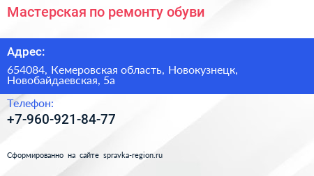 Мастерская по ремонту обуви по адресу 654084, Кемеровская область, Новокузнецк, Новобайдаевская, 5а в дальнейшем Организация, размещена в следующих категориях: