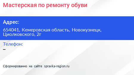 Мастерская по ремонту обуви по адресу 654041, Кемеровская область, Новокузнецк, Циолковского, 2г в дальнейшем Организация, размещена в следующих категориях: