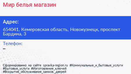 Мир белья, магазин по адресу 654041, Кемеровская область, Новокузнецк, проспект Бардина, 3 в дальнейшем Организация, размещена в следующих категориях: