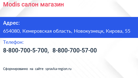 Modis, салон-магазин по адресу 654080, Кемеровская область, Новокузнецк, Кирова, 55 в дальнейшем Организация, размещена в следующих категориях: