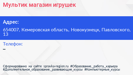 Мультик, магазин игрушек по адресу 654007, Кемеровская область, Новокузнецк, Павловского, 13 в дальнейшем Организация, размещена в следующих категориях: