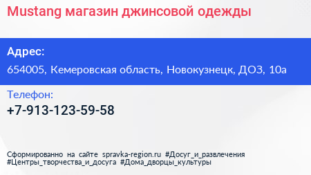 Mustang, магазин джинсовой одежды по адресу 654005, Кемеровская область, Новокузнецк, ДОЗ, 10а в дальнейшем Организация, размещена в следующих категориях: