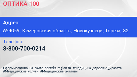 ОПТИКА 100% по адресу 654059, Кемеровская область, Новокузнецк, Тореза, 32 в дальнейшем Организация, размещена в следующих категориях:
