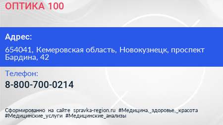 ОПТИКА 100% по адресу 654041, Кемеровская область, Новокузнецк, проспект Бардина, 42 в дальнейшем Организация, размещена в следующих категориях: