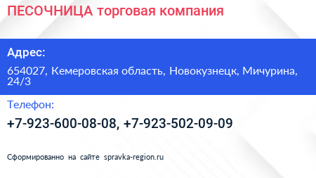 ПЕСОЧНИЦА, торговая компания по адресу 654027, Кемеровская область, Новокузнецк, Мичурина, 24/3 в дальнейшем Организация, размещена в следующих категориях: