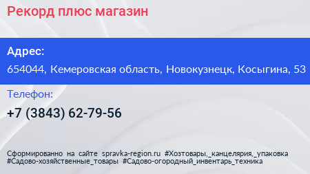 Рекорд-плюс, магазин по адресу 654044, Кемеровская область, Новокузнецк, Косыгина, 53 в дальнейшем Организация, размещена в следующих категориях:
