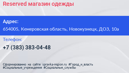 Reserved, магазин одежды по адресу 654005, Кемеровская область, Новокузнецк, ДОЗ, 10а в дальнейшем Организация, размещена в следующих категориях: