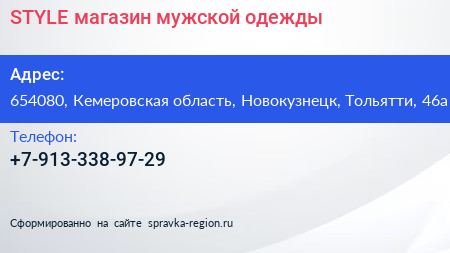 STYLE, магазин мужской одежды по адресу 654080, Кемеровская область, Новокузнецк, Тольятти, 46а в дальнейшем Организация, размещена в следующих категориях: