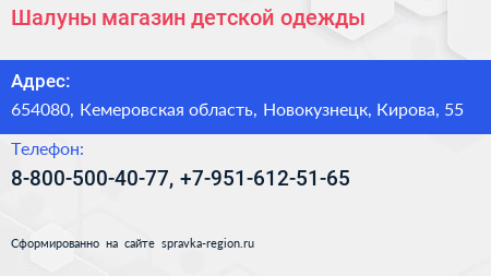 Шалуны, магазин детской одежды по адресу 654080, Кемеровская область, Новокузнецк, Кирова, 55 в дальнейшем Организация, размещена в следующих категориях: