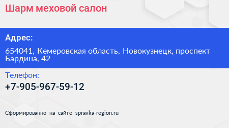 Шарм, меховой салон по адресу 654041, Кемеровская область, Новокузнецк, проспект Бардина, 42 в дальнейшем Организация, размещена в следующих категориях: