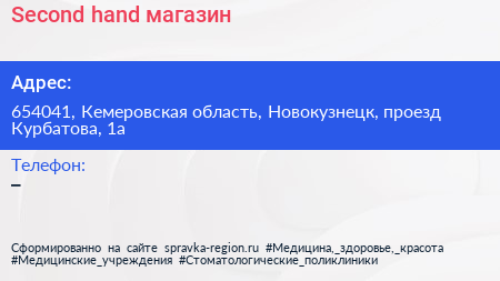 Second hand, магазин по адресу 654041, Кемеровская область, Новокузнецк, проезд Курбатова, 1а в дальнейшем Организация, размещена в следующих категориях: