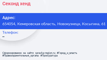 Секонд-хенд по адресу 654054, Кемеровская область, Новокузнецк, Косыгина, 61 в дальнейшем Организация, размещена в следующих категориях: