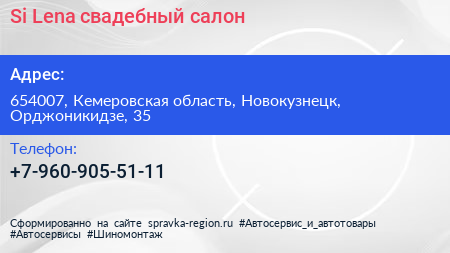 Si.Lena, свадебный салон по адресу 654007, Кемеровская область, Новокузнецк, Орджоникидзе, 35 в дальнейшем Организация, размещена в следующих категориях: