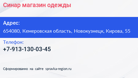 Синар, магазин одежды по адресу 654080, Кемеровская область, Новокузнецк, Кирова, 55 в дальнейшем Организация, размещена в следующих категориях:
