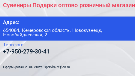 Сувениры & Подарки, оптово-розничный магазин по адресу 654084, Кемеровская область, Новокузнецк, Новобайдаевская, 2 в дальнейшем Организация, размещена в следующих категориях: