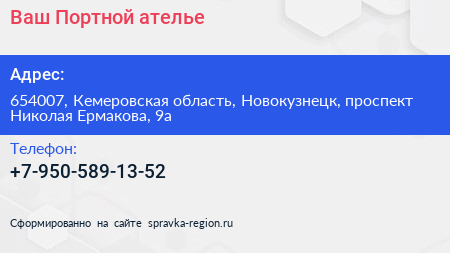 Ваш Портной, ателье по адресу 654007, Кемеровская область, Новокузнецк, проспект Николая Ермакова, 9а в дальнейшем Организация, размещена в следующих категориях: