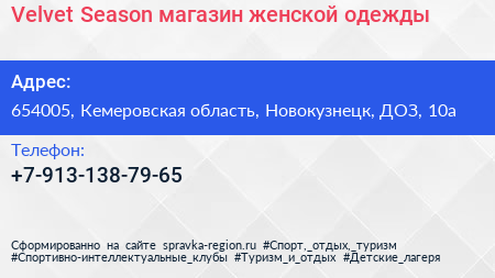 Velvet Season, магазин женской одежды по адресу 654005, Кемеровская область, Новокузнецк, ДОЗ, 10а в дальнейшем Организация, размещена в следующих категориях:
